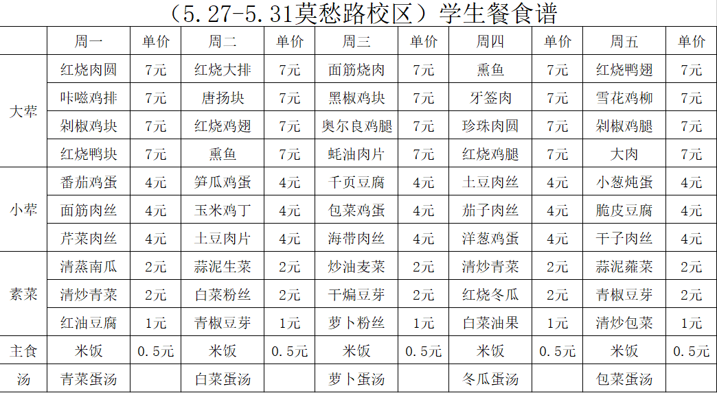 莫愁路校区学生一周菜谱(2024.5.27-2024.5.31)