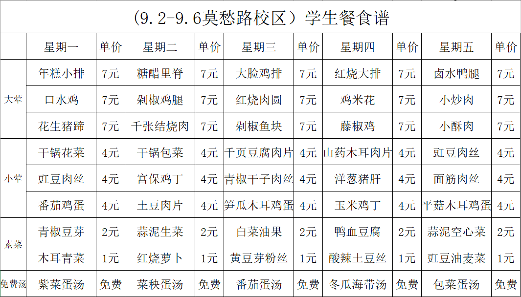 莫愁路校区学生一周菜谱(2024.9.2-2024.9.6)