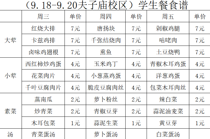 夫子庙校区学生一周菜谱(2024.9.18-2024.9.20)