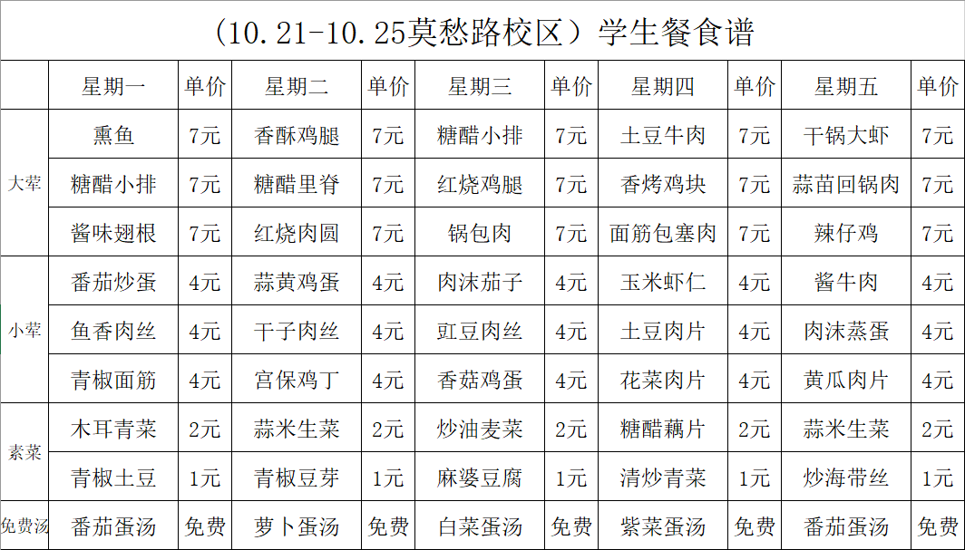 莫愁路校区学生一周菜谱(2024.10.21-2024.10.25)