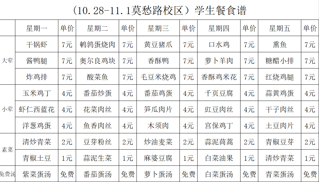 莫愁路校区学生一周菜谱(2024.10.28-2024.11.1)