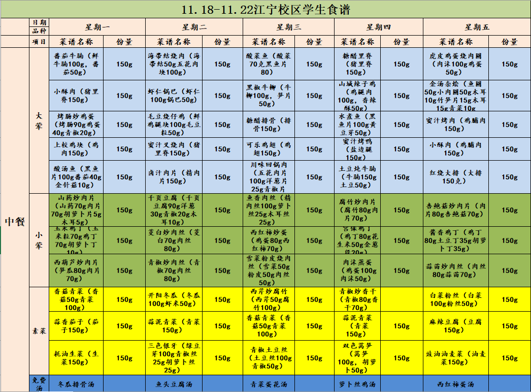 江宁校区学生一周菜谱(2024.11.18-2024.11.22)