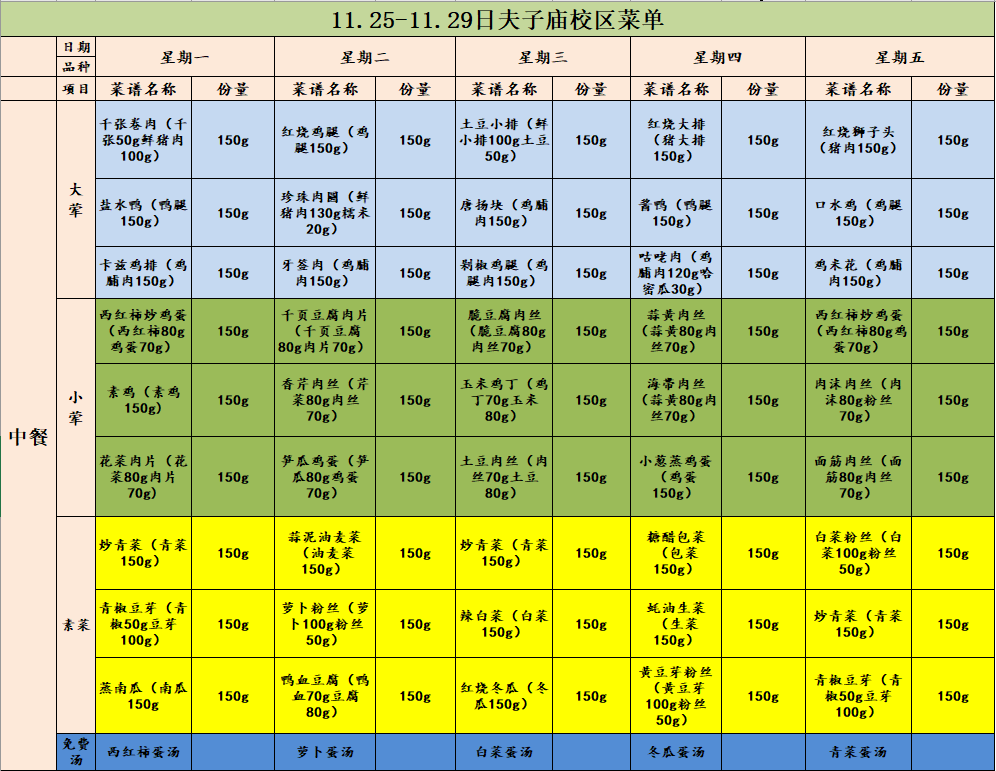 夫子庙校区学生一周菜谱(2024.11.25-2024.11.29)