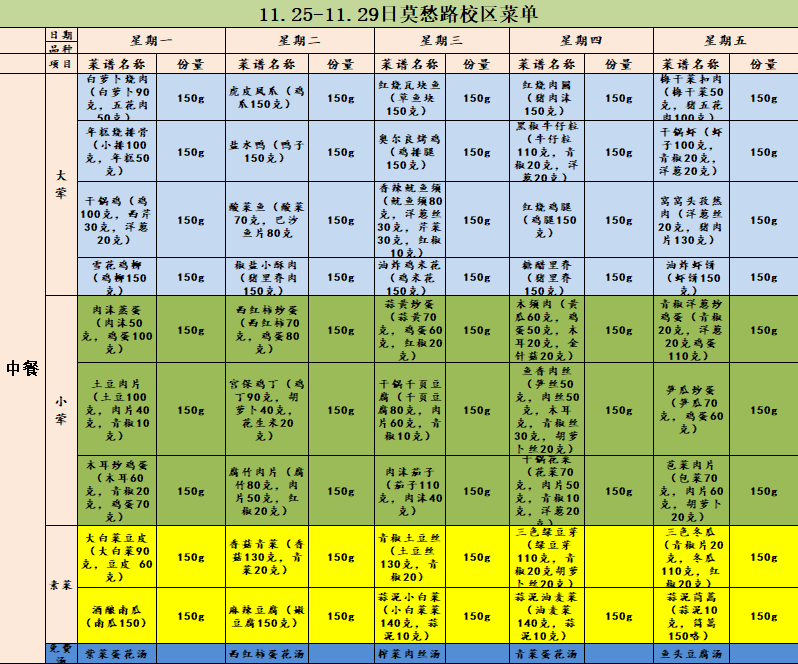 莫愁路校区学生一周菜谱(2024.11.25-2024.11.29)